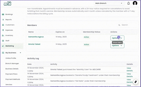 With an at-a-glance view, you can easily access a list of all members enrolled in each membership, along with their current status, making it simple to track active, expired, or upcoming renewals. Additionally, you have access to detailed logs, allowing you to see exactly when a membership was purchased by each customer and when benefits were redeemed during bookings. This streamlined view helps you manage memberships efficiently, giving you a comprehensive record of client activity and ensuring that you can monitor usage and maintain excellent customer service.